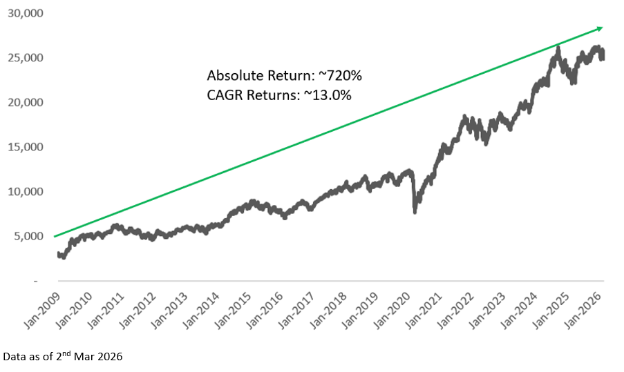 From 2009 to 2026, Nifty 50 delivered a strong performance of approx. 13.0% cagr (8x in 17 years)